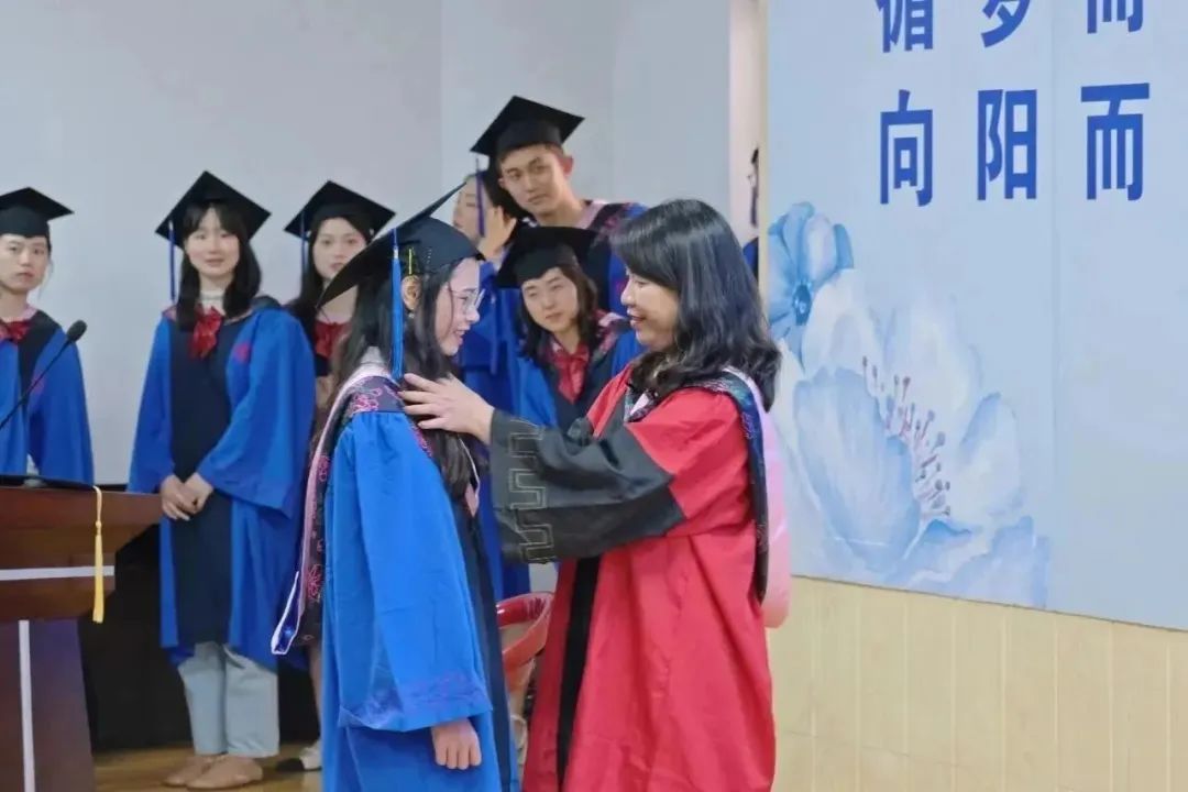 副院长周均旭致辞并宣读学位授予决定,随后本科、学术型硕士毕业生按顺序依次上台接受学位授予。毕业班班主任老师为每一位上台的毕业生整理衣冠,聂鑫、史云贵为获得学位的毕业生行拨穗礼并授予学位证书,庞惠等老师与获得学位的毕业生握手、拥抱,祝贺其顺利毕业。