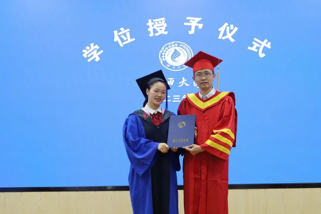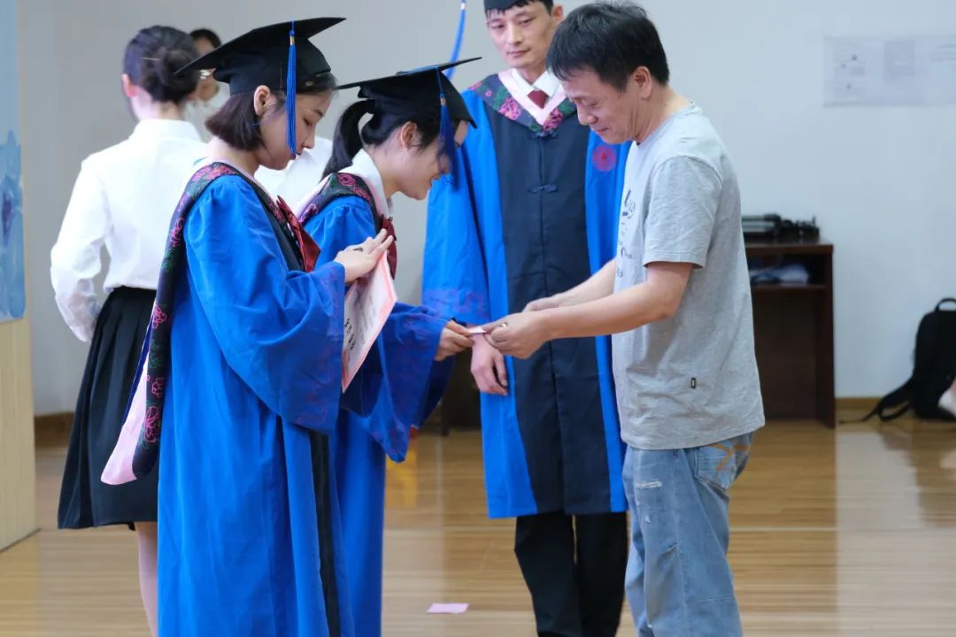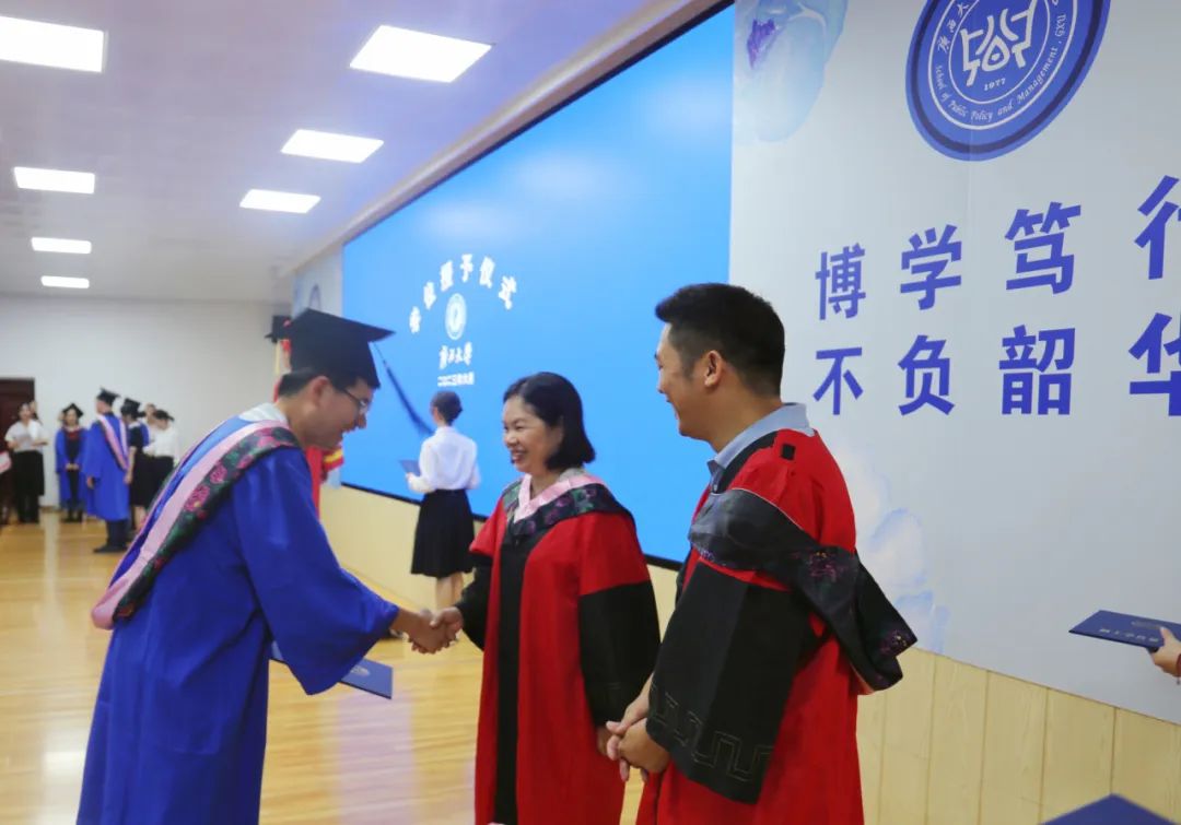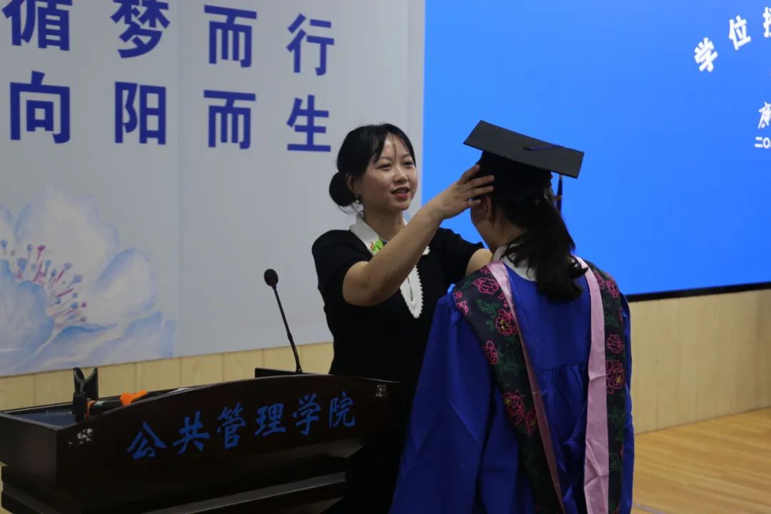 学位授予环节,周均旭宣读学位授予决定,毕业生们随着礼乐声依次上台。毕业班班主任雷文艳、钟革秋为学生整理衣冠,聂鑫为毕业生行拨穗礼,并一一合影,黎昌珍教授与魏万青教授分别和毕业生握手祝贺。最后,在全体师生的校歌大合唱中,H动漫 公共管理专业硕士(MPA)毕业典礼暨学位授予仪式圆满落幕。