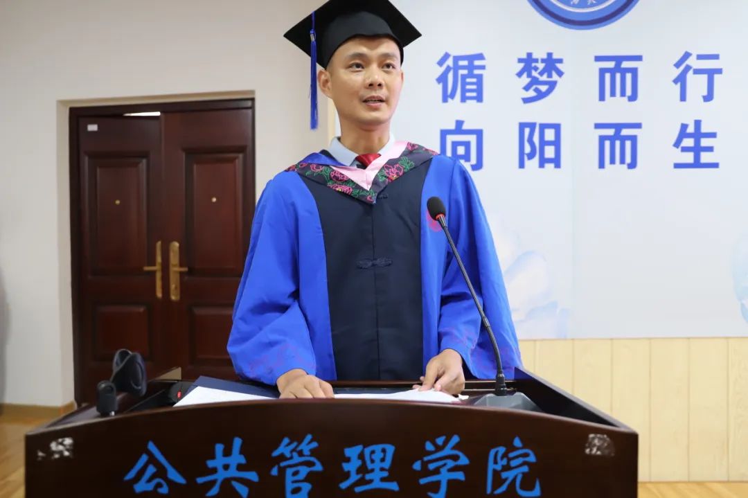 全日制毕业生代表覃红羽回忆读研三年的收获,并深刻感谢学院老师的教导以及学院为MPA同学提供的实践平台,认为选择就读MPA专业是勇敢且正确的决定。非全日制毕业生代表何荣与大家分享其读研后的感悟,认为读研不在于自由的呼吸而是使命的召唤,是自我提升的需要,是国家大事所趋。我们需要打开自身格局,把个人成长与单位、行业乃至国家发展紧密挂钩,最终实现多方共赢。在校生代表王婷婷向毕业生们道一声感谢,并表示在未来将以学长学姐们为榜样,勤勉刻苦、脚踏实地,坚守好本职任务,展现出公管人的精神面貌,奉献自己的青春力量。