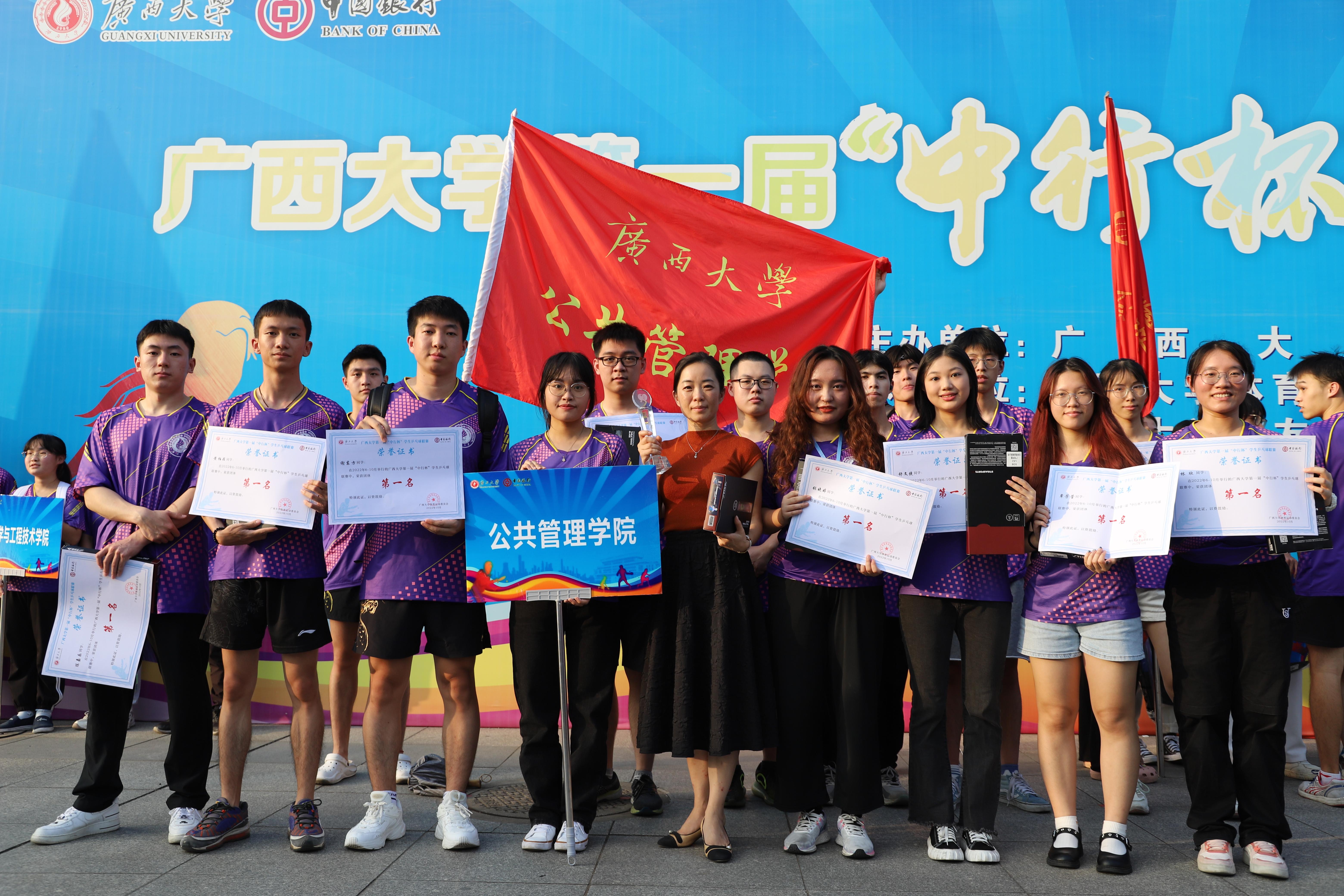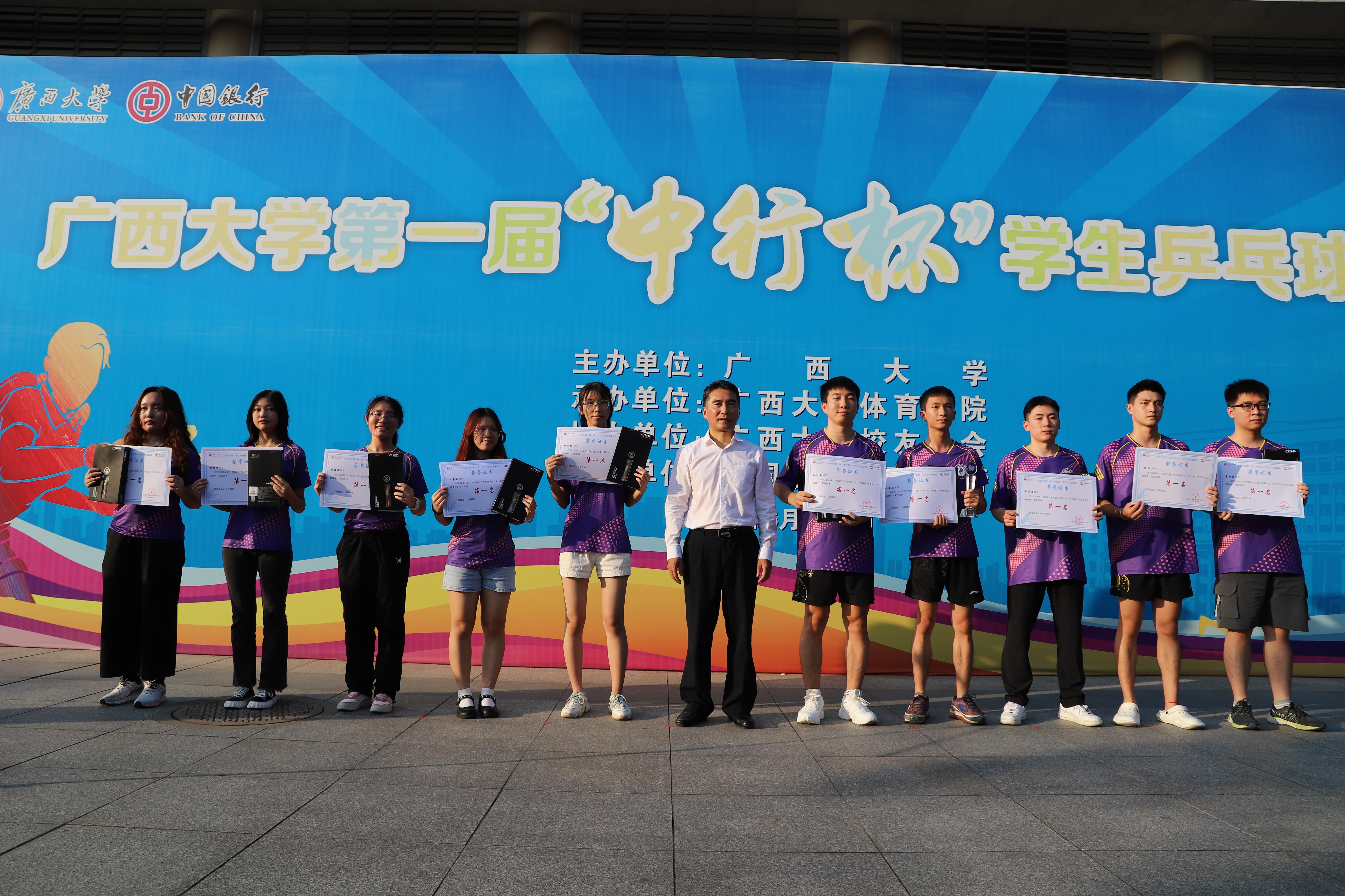 10月27日下午,广西大学第一届“中行杯”学生乒乓球联赛于西综合体育馆胜利闭幕,自治区政协副主席、校党委常委王乃学书记,校体委主席罗延荣副校长,校党委常委、总会计师宁旭初出席闭幕式。H动漫 学生代表队在此次乒乓球联赛中获得“混合团体总分第一名”的好成绩。