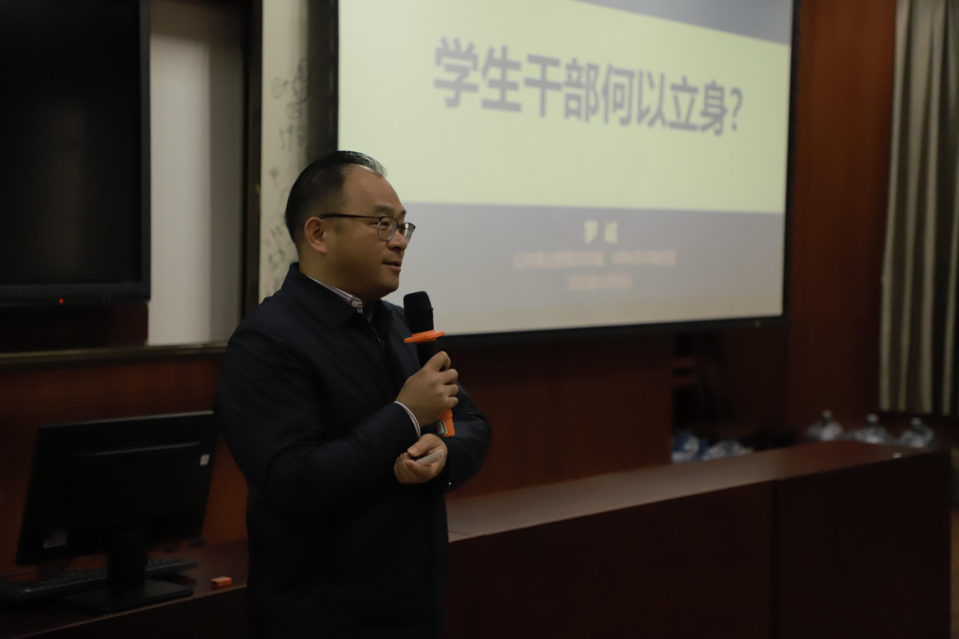 罗诚结合自身成长经历以“学生干部何以立身”为主题,从四个方面给大家介绍了“何以立身”的经历、认识和方法。第一,谈经历:文字能不能立身。机会对每个人都是平等的,一个优秀的学生干部,应该锻炼和具备四力,即脑力、脑力、眼力、笔力。第二,谈认识:为何能以文字立身。学生干部们应好好锻炼个人公文写作能力,掌握写作知识、锻炼写作能力和提高写作素养。专注于一件事,经历两万小时淬炼,任何人都能在自己的领域中从平凡变卓越。第三,谈方法:如何以文字立身。写作之前要五问,要问立意、问主题、问结构、问材料、问语言。第四,谈秘籍:人人皆可以文立身。要想成为写手,一是要多读好书,书中自有黄金屋;二是处处留心皆学问,注意观察,勤于思考;三是胆大心细脸皮厚,要树立自信,思维敏锐以及具备良好的心理素质;四是一日三省吾身,好文章是想出来的,要学会清晨“六问”和静夜“六思”;五是写作之事要躬行,好文章是练出来的。作为学生干部,不仅要立身还要立心,要努力修炼自己,成为德智体美劳兼备的“极品”。