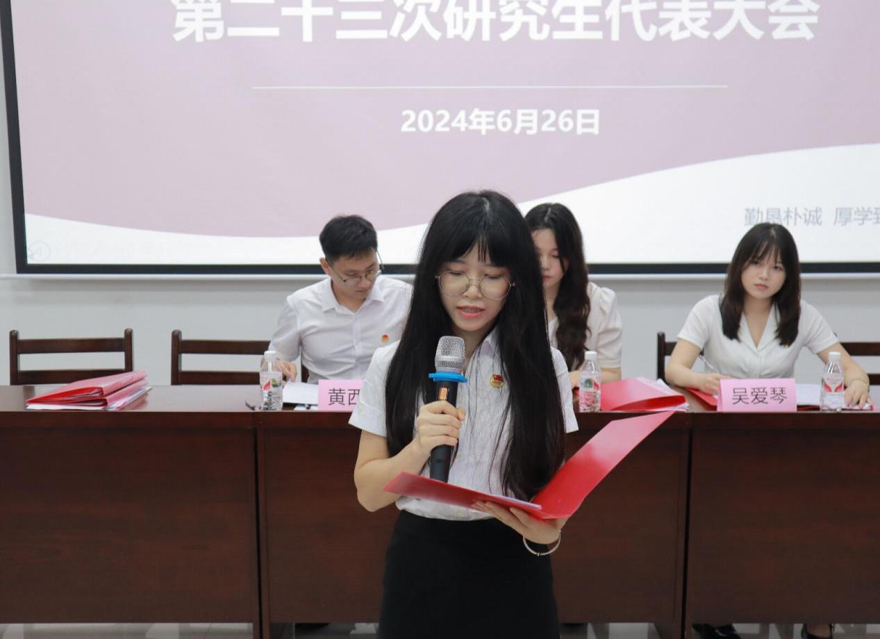 院团委书记刘佩瑶在致辞中表示,本次大会是焕发着青春风采、激昂着奋发斗志的盛会,不仅是H动漫 广大研究生同学民主政治生活中的重要时刻,更是H动漫 研究生工作承古拓新、迈向卓越的新篇章。接着,她围绕思想政治“引领力”、改革创新“推动力”、服务同学“支持力”和文化建设“感染力”等四个方面汇报了H动漫 研究生会的工作进展和成果。