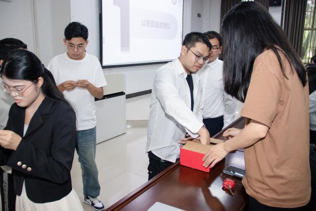 在主持人简要介绍了活动流程后,活动正式拉开序幕,进入第一个环节:公务员面试模拟。收到面试通知短信的六位同学参加签到与抽签环节,按照先后顺序签到,并现场抽签决定分组。分组后,所有考生将集中在111教室候场等待面试开始。本次面试严格遵循结构化面试的流程和标准进行。
