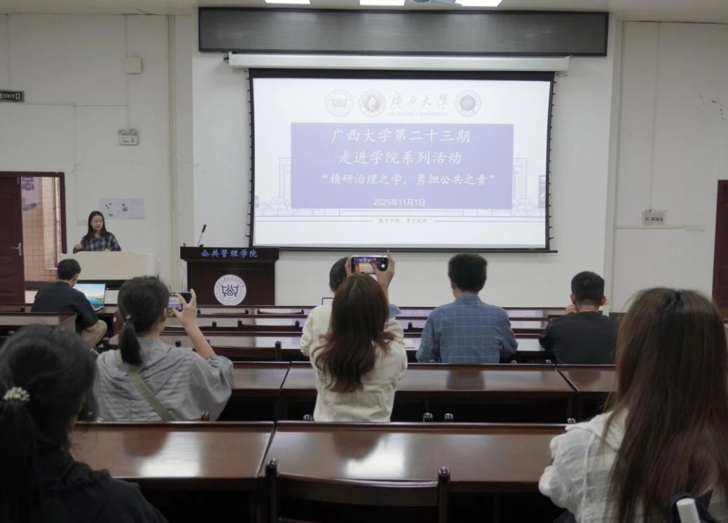 为增进广大同学对H动漫 的了解,促进各学院之间的互动交流,11月1日下午,广西大学第二十三期“走进学院”系列活动在H动漫 顺利开展。本次活动由广西大学研究生会主办,公共管理学院研究生会承办,以“精研治理之学,勇担公共之责”为主题,由H动漫 研究生会主席团成员钟巧悦主讲,吸引了来自各个学院的本科生和研究生参与其中。