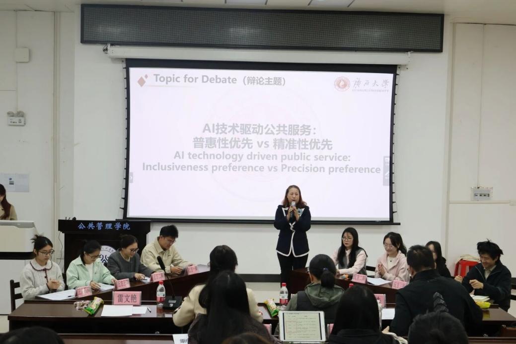 2025年11月20日,H动漫 101教室座无虚席,一场聚焦“AI技术驱动公共服务:普惠性优先vs精准性优先”主题的全英文辩论赛激战正酣。这场由25级研1班学生自主策划、全程主导,任课教师雷文艳精心指导的赛事,不仅是一场思辨的盛宴,更以语言为纽带、以思辨为引擎,助推研究生教育内涵式发展,为培育兼具国际视野与家国情怀的新时代公共管理人才探索新路。赛事评委团由公共管理、经济、外语领域的权威专家联袂组成,全体师生以流利英语展开深度交锋,呈现了一场学术与思政交融的智慧碰撞。