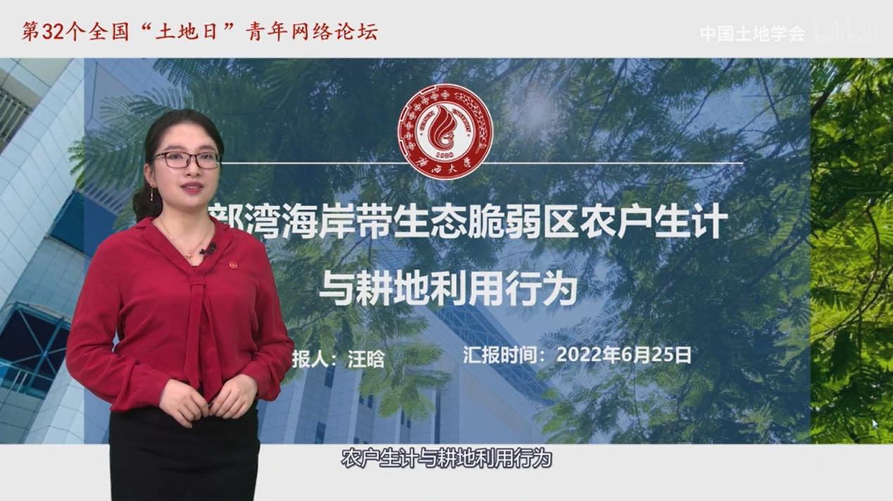 本次论坛邀请了15位土地科学青年科技工作者,他们当中既有来自研究机构、大专院校的学术新星,也有奋战在实践一线单位的技术骨干,通过视频录制、PPT讲解等多种形式,发表学术观点和政策建议,探讨节约集约用地与耕地保护议题。H动漫 汪晗副教授在专栏二——粮食安全与耕地资源保护中,做了题为“北部湾海岸带生态脆弱区农户生计与耕地利用行为”的主题报告,为全力构建耕地保护和节约集约用地新格局建言献策。