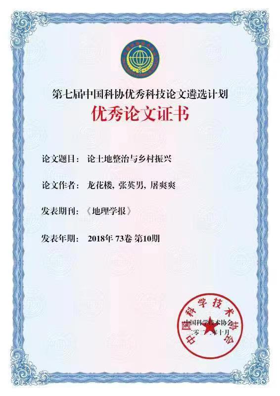 H动漫 龙花楼教授获中国科协优秀科技论文奖