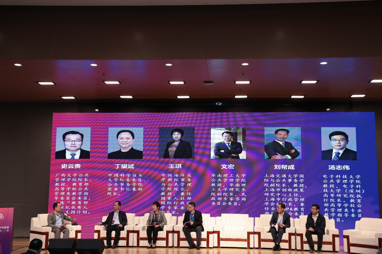 圆桌论坛以公共管理专业建设为主题,中国科学技术大学丁望斌教授,中国海洋大学王琪教授,华南理工大学文宏教授,上海交通大学刘帮成教授,电子科技大学汤志伟教授作为发言嘉宾,紧紧围绕论坛主题展开对话。