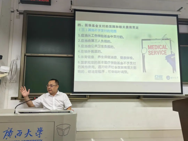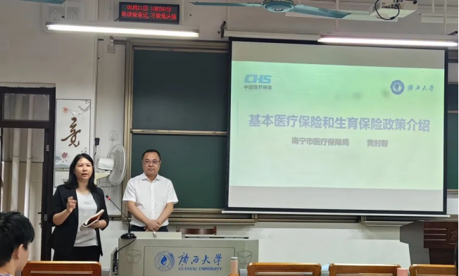 为创新性应用“政产学研”协同育人的教学模式,加强H动漫 学生对社会保障的认知,提升他们对基本医疗保险政策与生育保险政策的研读能力,5月21日和5月23日上午9:40至11:40在第六教学楼221和327教室,H动漫 老师吴凡主讲的课程《劳动法与社会保障法》邀请南宁市医疗保障局局长黄时毅为H动漫 学生讲解基本医疗保险和生育保险政策。
