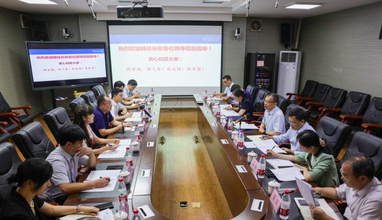 8月26日上午,校党委副书记、校长韩林海带领学校开学工作检查组到学院检查2024年秋季学期开学情况。汇报会由学院书记聂鑫主持,学院班子成员、系主任、办公室主任等参加了汇报会。