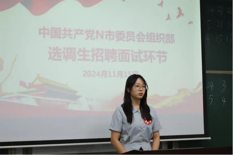在宣讲会环节,宣讲人王露、李若源分别从地区情况、配套政策、招录介绍、选调程序四个方面对N市选调生招聘进行了全面而详细地介绍,帮助报考定向选调生的学生熟悉选调生招考基本情况。