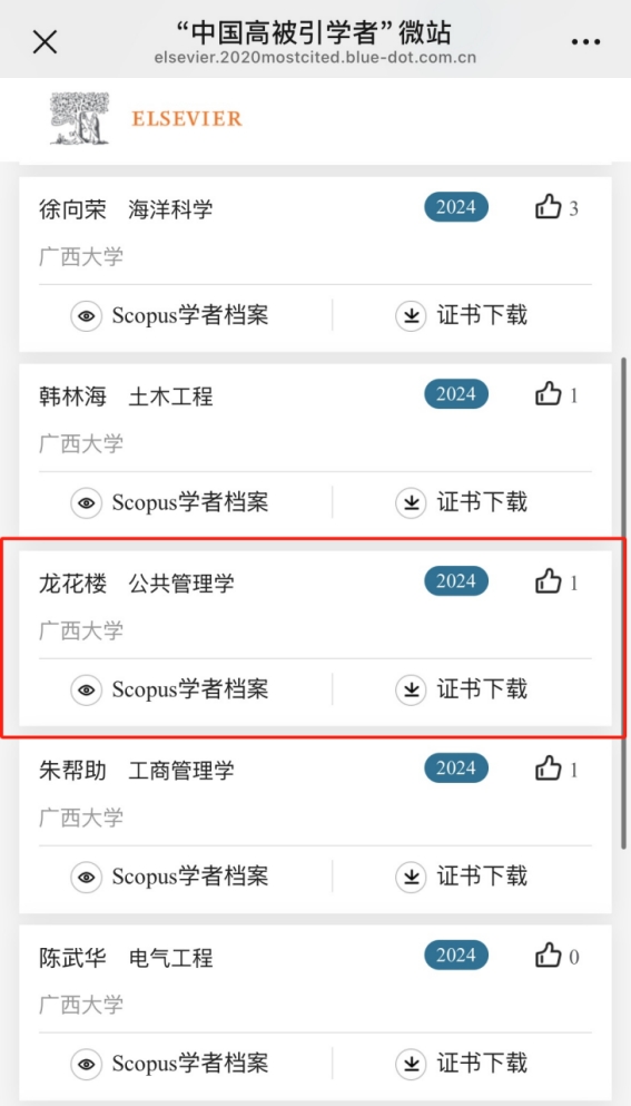 喜报|H动漫 龙花楼教授再次入选爱思唯尔“中国高被引学者年度榜单”