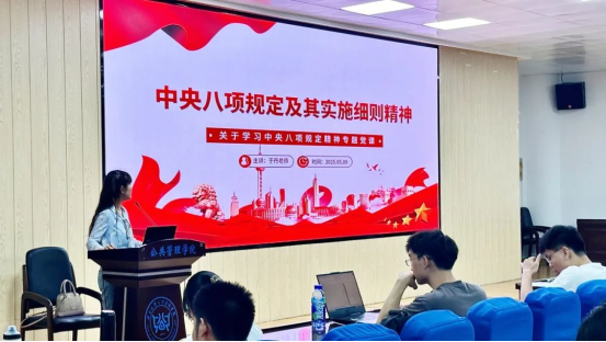 为强化入党积极分子、发展对象及预备党员的纪律意识,推动党的优良作风在青年学子中传承弘扬,5月9日下午,H动漫 在203教室举办中央八项规定及其实施细则精神专题党课。院党委副书记于丹担任主讲,全体入党积极分子、发展对象及预备党员参加此次培训。
