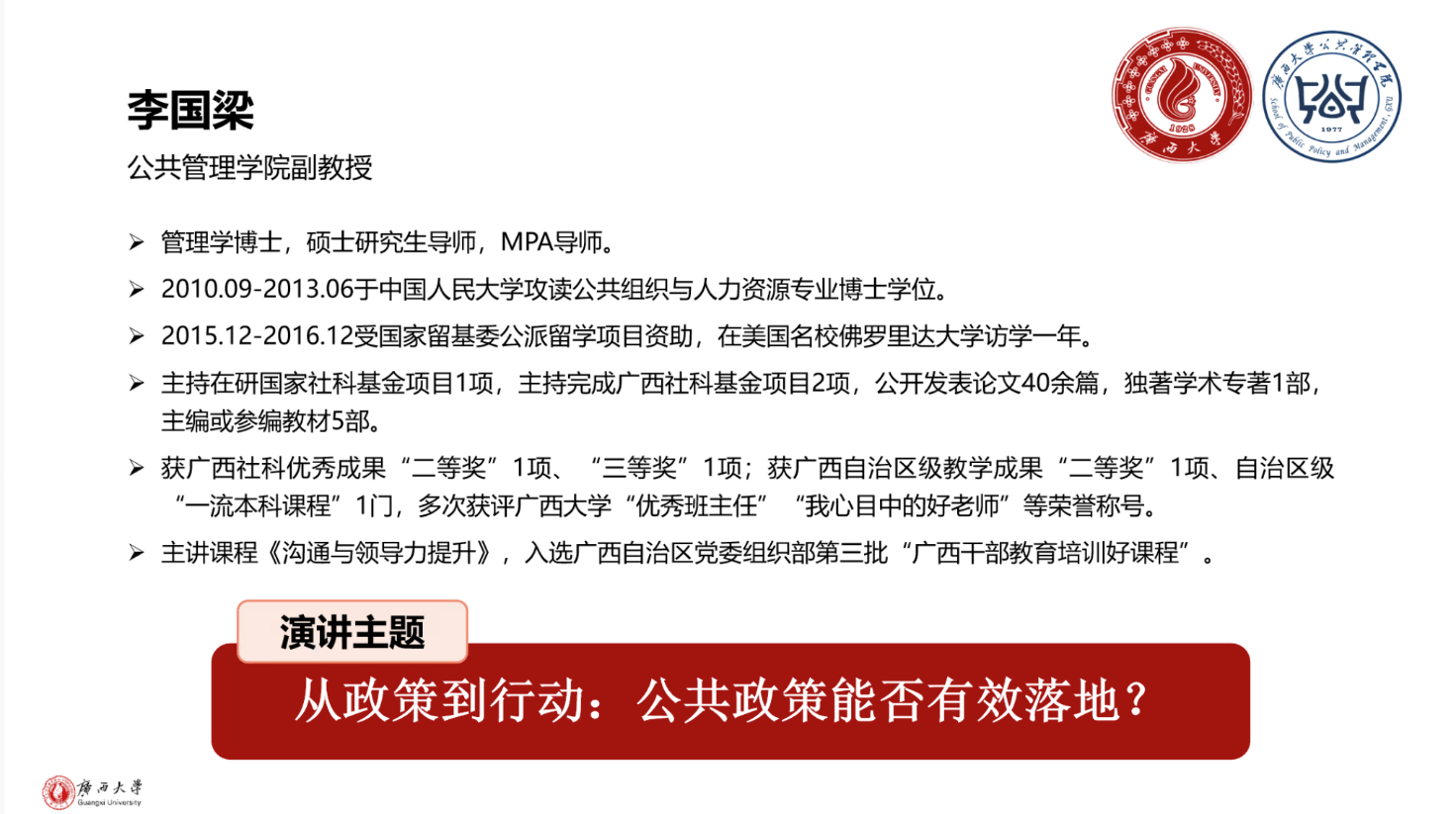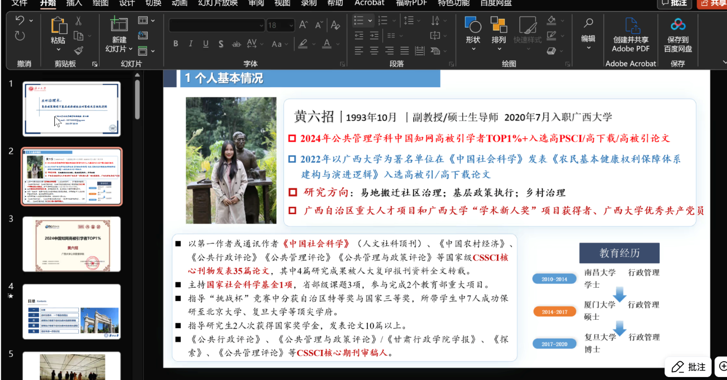 “基层治理工作坊” 于线上腾讯会议顺利举办。李国梁副教授、吴凡教授、黄六招副教授、马珍妙副教授、陈武朝博士分别围绕公共政策落地、科技人才开发、基层治理实践、企业创新与环境监管、健康中国行动等研究主题展开分享。各位老师的分享既展现了扎实的学术功底与丰富的实践经验,也为营员们提供了多元化的研究视角和深刻的实践启示,为其后续学术探索奠定了坚实基础。