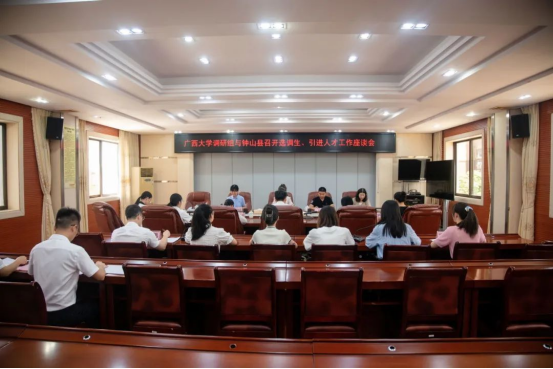 为贯彻落实学校党委关于选调生工作的重要决策部署,深入了解我校选调生在县域基层的工作现状与思想工作动态,推动选调生“君武青苗”行动落到实处,7月24日,学院党委副书记于丹,校学生工作部(处)王天亮,学院团委书记刘佩瑶,团委副书记侯俊丽一行赴贺州钟山县走访调研选调生工作,召开选调生代表座谈会。钟山县县委常委,组织部长黎科及广西大学选调生代表出席座谈会。