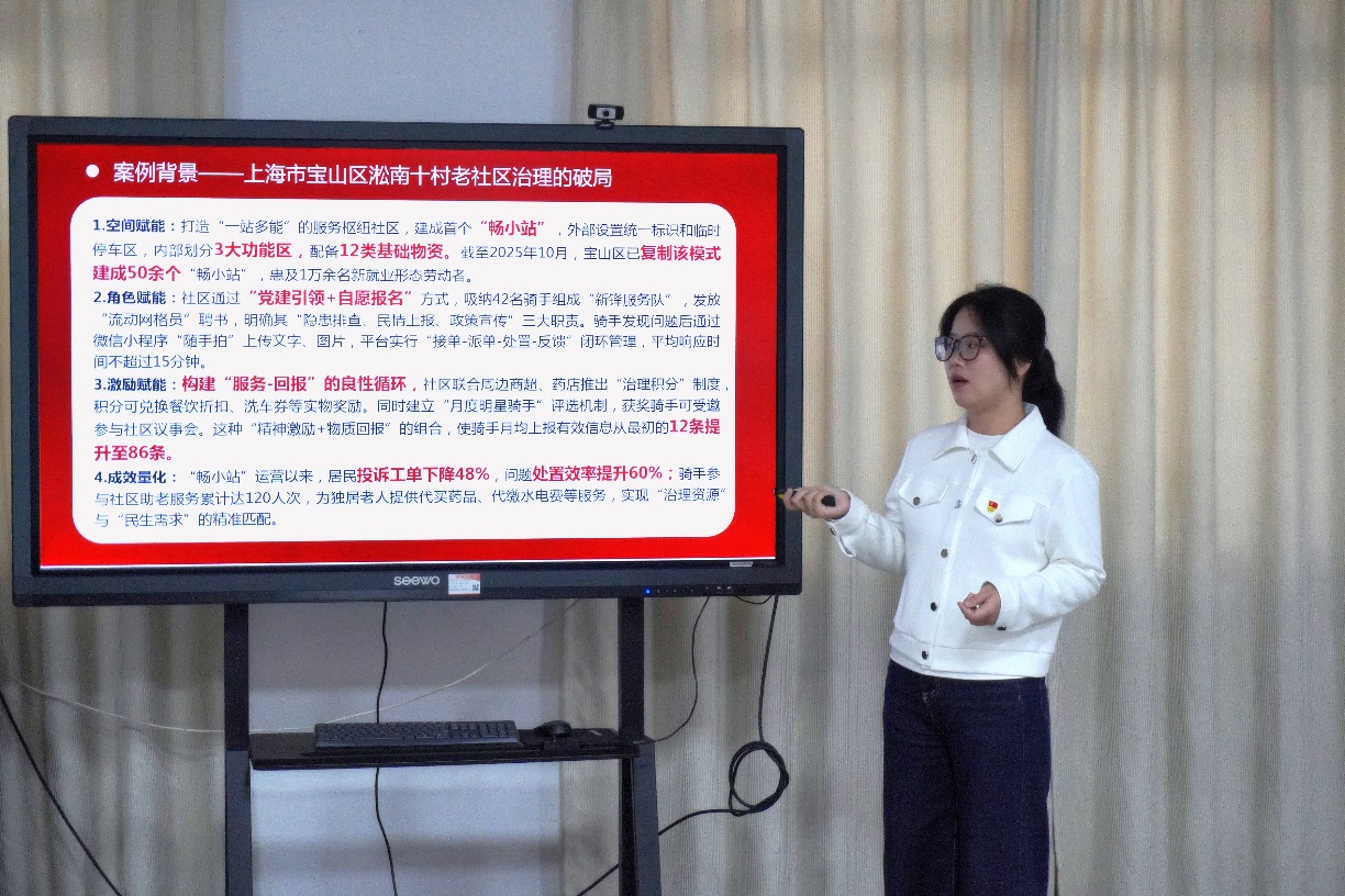在案例成果展示环节,四个小组依次汇报了本组运用党的二十届四中全会精神分析破解基层治理难题的实践成果。各小组聚焦新就业群体党建、公共空间治理、基层数字赋能、大数据核查“机械清退”等前沿议题,展示了AI技术辅助下的创新分析路径与解决方案,充分体现了党建与业务深度融合的研讨实效。