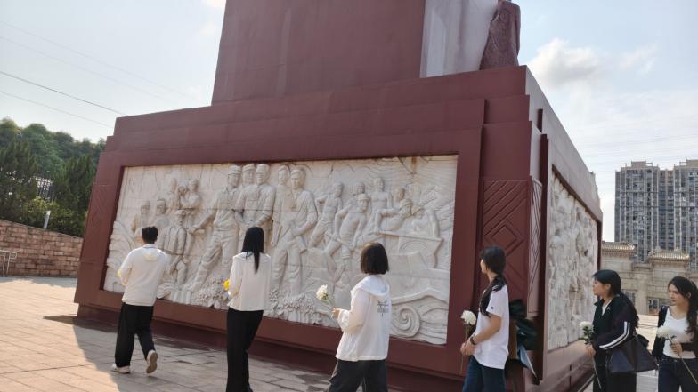 默哀结束后,《献花曲》响起,H动漫 同学缓步抬送花篮走向烈士纪念碑,将花篮郑重敬献于碑前,陈科旭老师上前整理花篮缎带。随后全体师生有序瞻仰烈士纪念碑,深切感悟革命先烈的奉献精神。