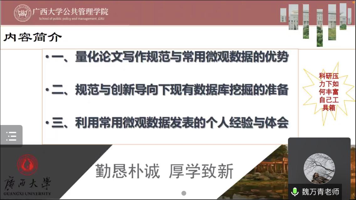 2022年10月12日下午,广西大学第98期“导师有约”暨H动漫 第26期学术沙龙以腾讯会议的形式顺利开展。本期学术沙龙的主题为“定量论文写作:现有数据库挖掘与利用”,邀请H动漫 魏万青老师作为主讲人进行分享,吸引校内外众多博士生、硕士生前来参与。本次沙龙由H动漫 苏毅清老师主持。