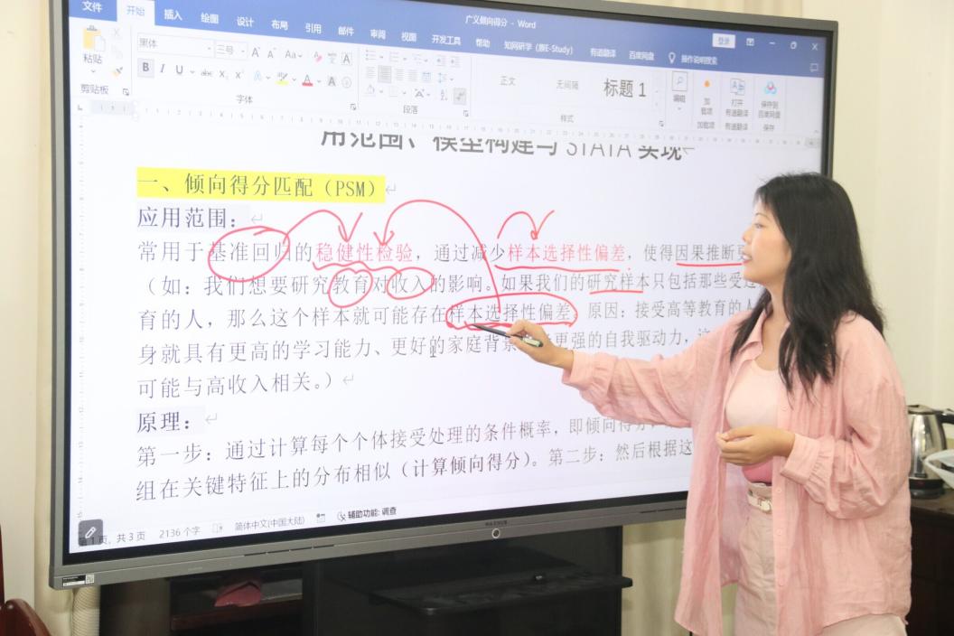 张小银同学分享的题目为《基于广义倾向得分匹配(GPSM)的非线性关系检验——适用范围、模型构建与STATA实现》。她首先介绍了倾向得分匹配模型的原理和应用范围,以此引申至核心概念——广义倾向得分匹配,并介绍了其在控制选择性偏差和揭示非线性关系两个方面所展现的优势。随后,她通过对经典文献的具体解读和公式推导,阐述了广义倾向得分匹配模型的检验步骤,即计算广义倾向得分——平衡性检验——剂量反应和处理效应。