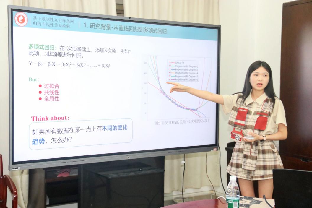 禤媛同学分享的题目为《基于限制性立方样条回归的非线性关系检验》。她首先以直线回归与多项式回归研究的局限性为引,介绍了更具优势的方法——限制性立方样条回归,并阐述了其基本原理。随后,她从论文撰写应用、计算机代码实现以及实例分析三个方面,详尽地展示了该方法在科研中的实践运用过程,并强调了在运用该方法时需要注意的几个具体节点。