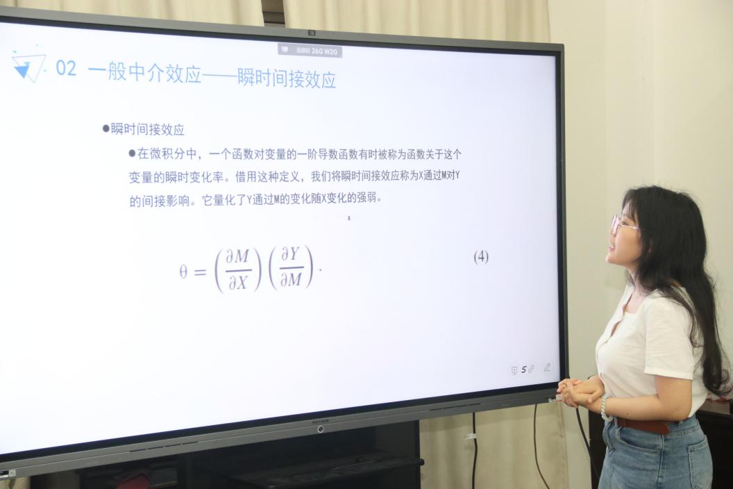 陈潇寒同学分享的题目为《非线性中介效应的构造与检验》。她首先介绍了线性中介与非线性中介两个模型间的区别与联系,引入了瞬时间接效益这一概念,并通过函数公式、文献综述、图形建模等方式,详细地推导了瞬时间接效益在两个模型中的应用过程。随后,她以Sobel中介效益检验法和Bootstrap抽样法为检验方法,以“城镇化影响下劳动力外流对土地流转的影响”为应用背景,为同学们介绍了中介方法在论文撰写中的具体运用。