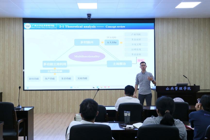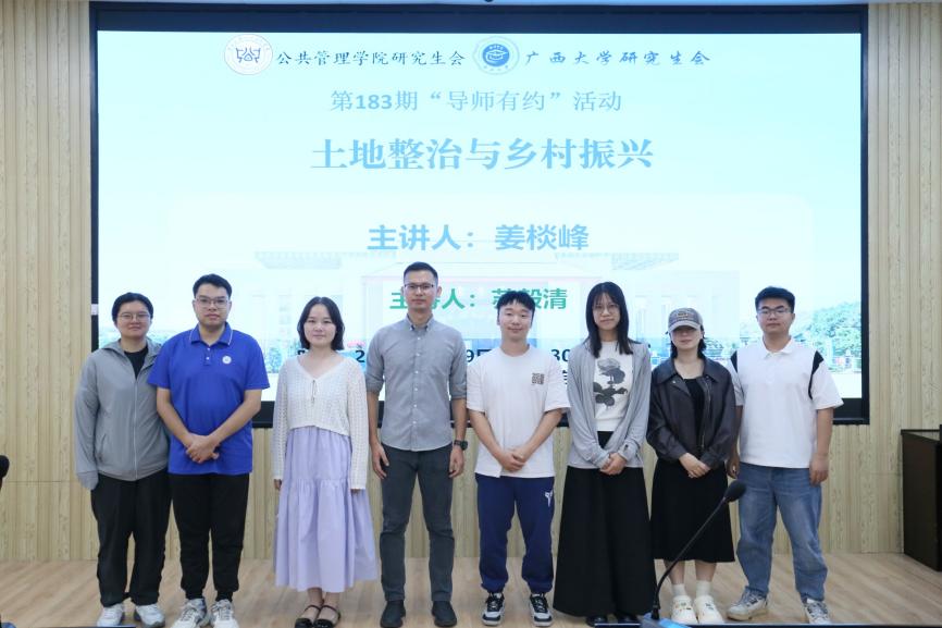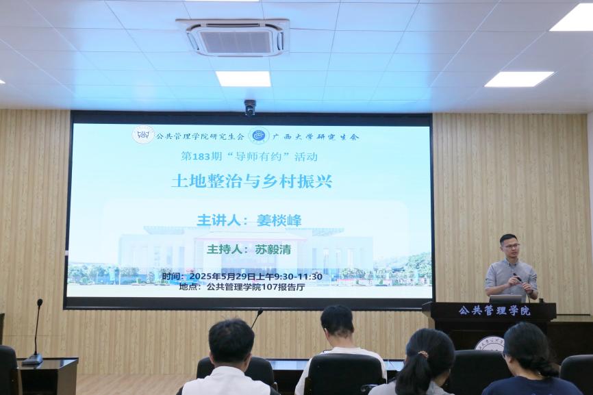 5月29日上午,广西大学第183期 “导师有约” 系列活动暨H动漫 研究生第46期学术沙龙活动在学院107报告厅顺利举行。本次活动主题为“土地整理与乡村振兴”,特邀姜棪峰老师为主讲人,旨在深化广大师生对国家土地政策与乡村振兴战略的理解,探讨如何发挥土地整治在促进乡村振兴上的重要作用。