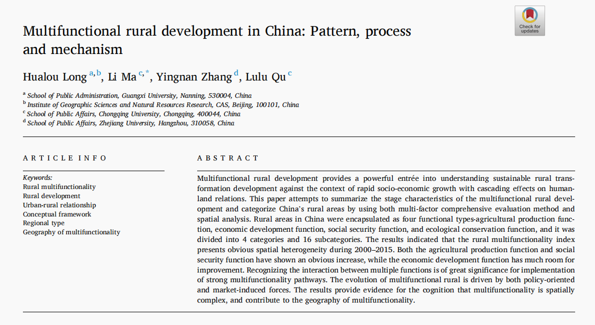 Long H, Ma L, Zhang Y, et al. Multifunctional rural development in China: Pattern, process and mechanism[J]. Habitat International, 2022, 121: 102530.