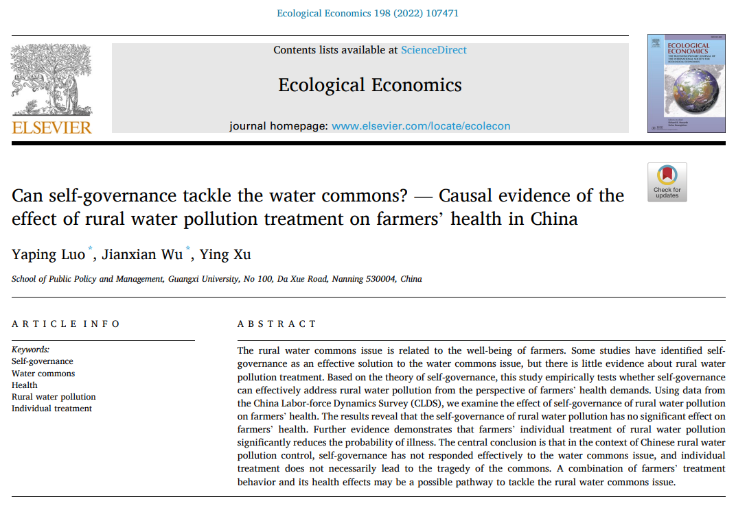 【引用格式】 Yaping Luo, Jianxian Wu, Ying Xu, Can self-governance tackle the water commons? — Causal evidence of the effect of rural water pollution treatment on farmers' health in China, Ecological Economics, Volume 198, 2022, 107471.