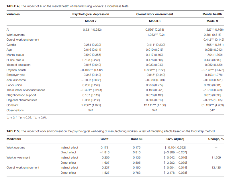 Wei W, Li L. The Impact of Artificial Intelligence on the Mental Health of Manufacturing Workers: The Mediating Role of Overtime Work and the Work Environment. Front Public Health. 2022 Apr 11;10:862407. doi: 10.3389/fpubh.2022.862407. PMID: 35480579; PMCID: PMC9035848.