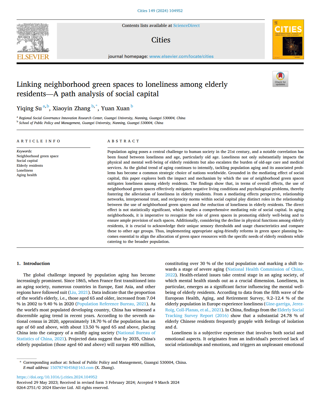 Yiqing Su, Xiaoyin Zhang*, Yuan Xuan (2024). Linking neighborhood green spaces to loneliness among elderly residents—A path analysis of social capital. Cities, 149,104952.