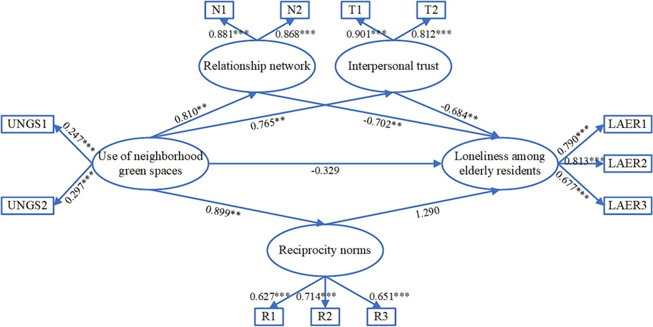 该文采用IV-OLS回归和带有结构方程的多重中介效应模型方法开展实证分析。研究发现,从总效应上看,社区绿色空间使用能够有效抑制负面生活状态和心理问题的产生,从而促进了老年孤独感的缓解。从中介效应来看,社会资本中的关系网络、人际信任和互惠规范三条路径在社区绿色空间使用与老年孤独感的缓解中起着不同的作用。