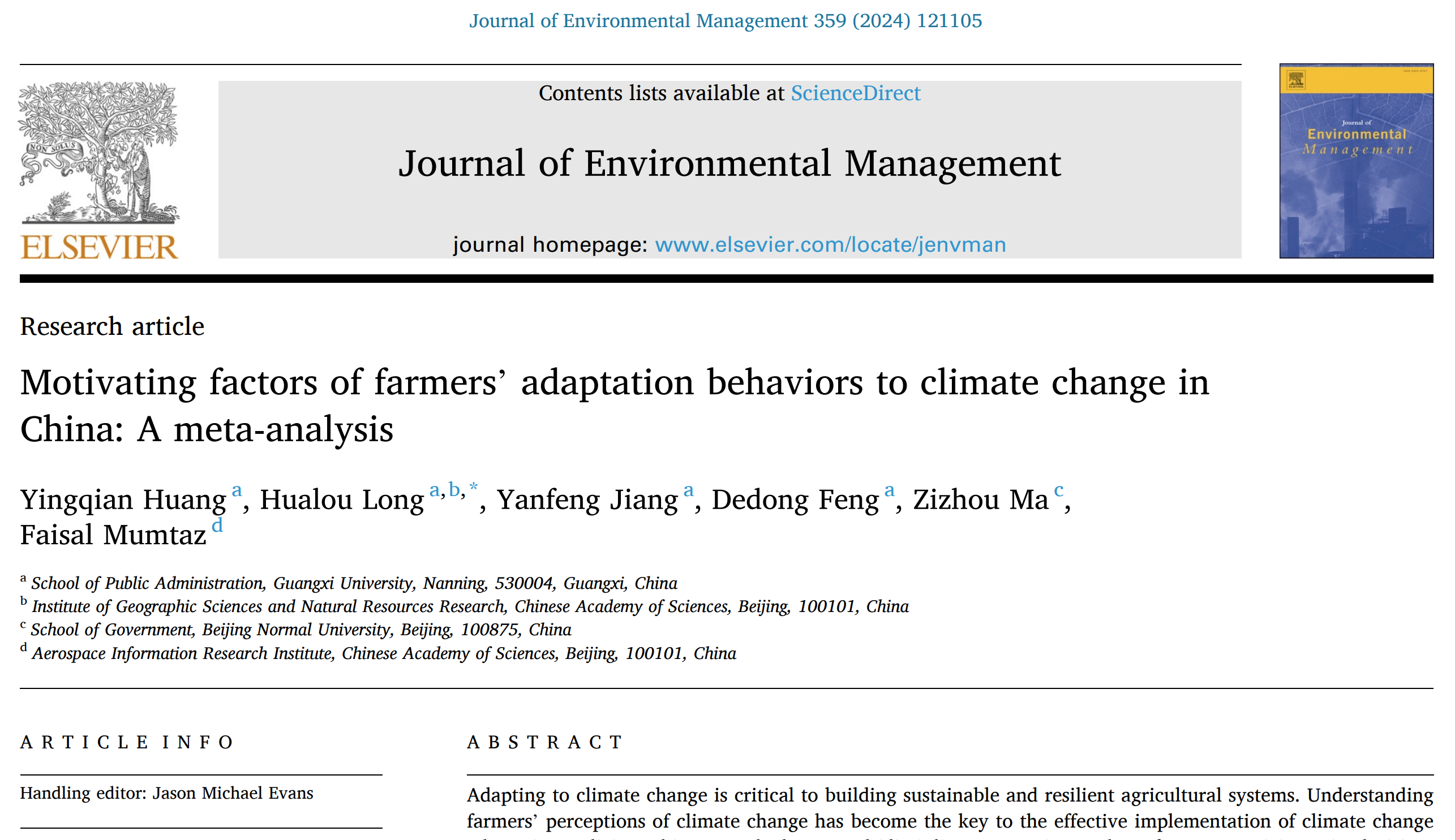 Huang, Y.Q., Long, H.L., Jiang, Y.F., Feng, D.D., Ma, Z.Z., Mumtaz, F., 2024. Motivating factors of farmers’ adaptation behaviors to climate change in China: A meta-analysis. Journal of Environmental Management, 359, 121105.