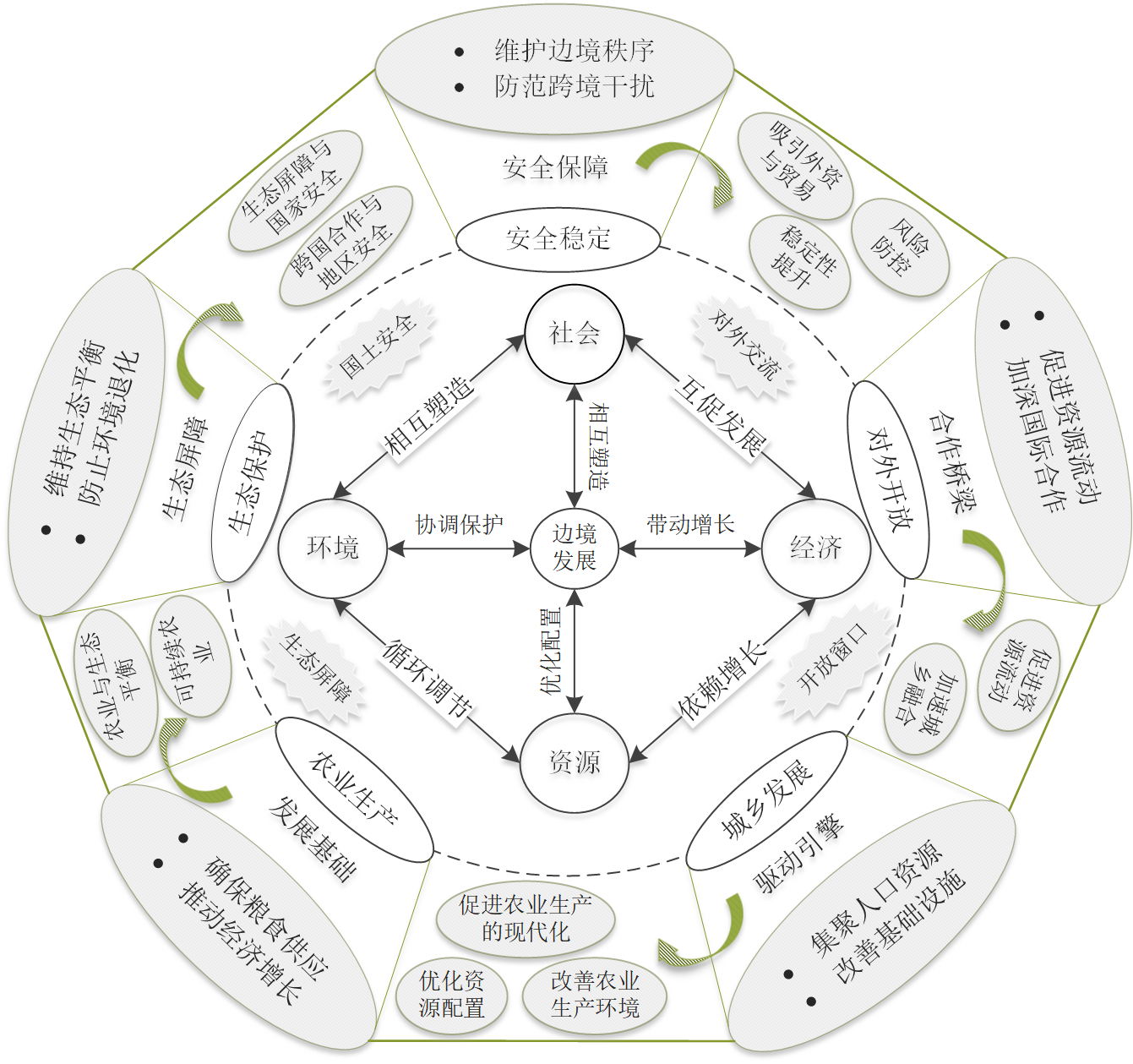 在全球化与地缘格局深刻重塑的背景下,中国陆地边境地区正由国家的“地理边缘”逐步转向“战略前沿”,这一转变反映了国家安全、经济发展与生态文明格局的深度重构。作为连接国内外的关键地带,边境地区承担着安全屏障、开放门户、生态屏障与区域协调发展的多重使命。随着“一带一路”倡议、西部大开发和兴边富民等战略的持续推进,边境地区在要素流动与空间治理中地位日益凸显,但同时也面临发展不均衡、资源利用效率不高和生态环境脆弱等挑战。为深化对边境地区发展的认识,研究构建了“安全稳定—对外开放—城乡发展—农业生产—生态保护”五维地域功能测度框架(图1),从多维视角识别地域功能结构及其演进规律。探讨地域功能与经济、社会、资源、环境系统之间的多维协调关系,可为优化国土空间格局、促进边境地区高质量发展提供科学依据与实践支撑。