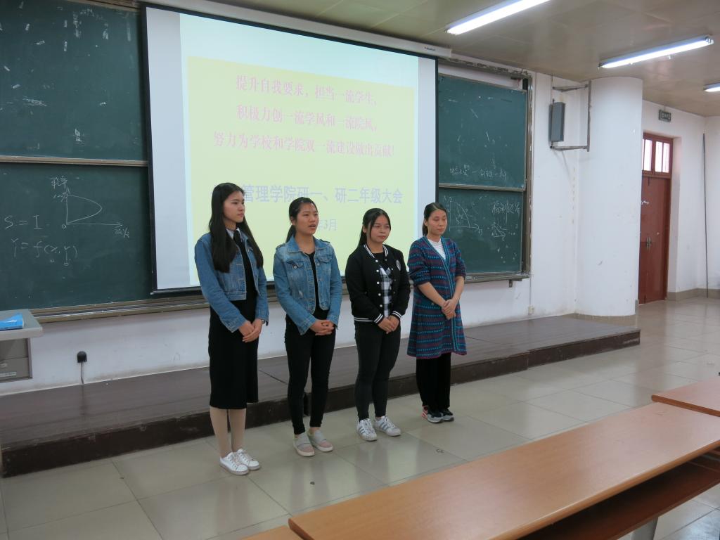 紧接着, 甘书记就为做好本学期工作以及加强研究生管理展开讲话。甘书记特别强调了研究生思想政治工作的重要性,尤其指出要以习近平新时代中国特色社会主义思想和党的十九大精神为统领,不折不扣落实好学校党委的相关要求和部署,积极配合学校“双一流”建设,贯彻落实学院党委提出的建设“一流学风、一流院风”的方针,建设好中国特色社会主义意识形态阵地。随后,甘书记向同学们仔细讲解了推优入党的相关事宜,强调希望同学们在正确认识中国共产党的基础上积极做好推优入党的准备,首先做到思想上入党,在入党动机上要有更高的觉悟。之后,甘书记针对安全防范、卫生,上课出勤,学生活动,遵规守纪以及其它日常工作都提出了具体要求。提醒学生在校内注意自身财物的保管,校外注意交通安全,保证自身安全。并要求学生党员、学生干部充分发挥带头作用,发挥主观能动性,辅助老师开展好各项工作。