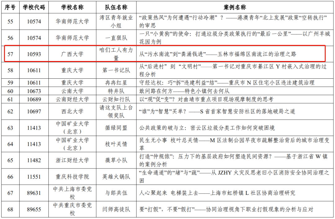 本届案例大赛共有来自186所院校的1884支队伍报名,经过案例提交、文本审查等环节,最终178所院校的1382支队伍提交有效案例。H动漫 高度重视本次案例大赛,去年底专门召开赛前动员会,共有36支队伍报名提交了参赛案例,经过学院专家组的评分排序,最终选送22支队伍的案例参加本次中国研究生公共管理案例大赛。由H动漫 苏毅清老师指导的参赛案例《从“污水南流”到“粪涌钱进”——玉林市福绵区南流江的治理之路》获得大赛得三等奖,H动漫 也获“优秀组织奖”。