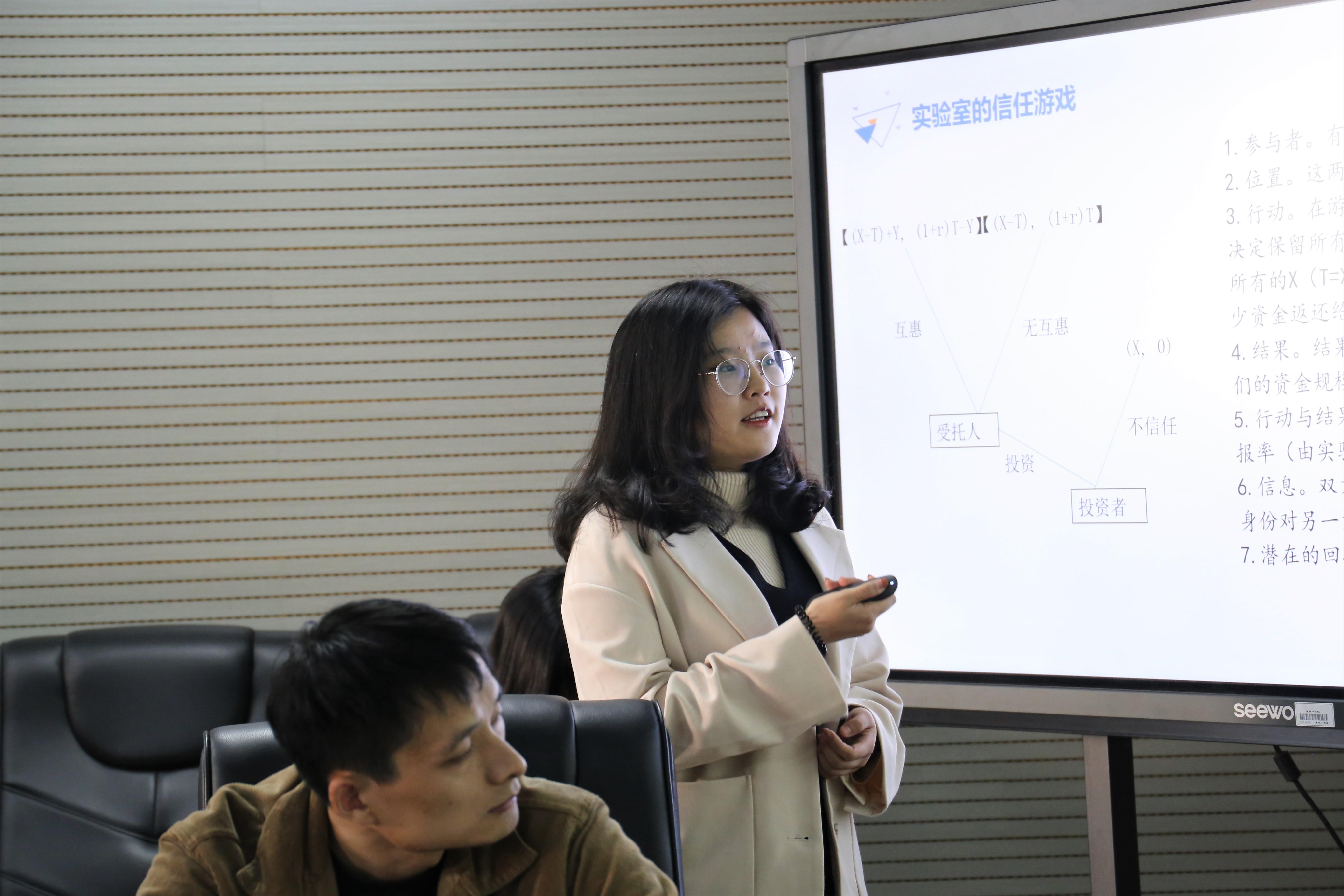 李睿同学分享到,制度多样性构成了人类最基本的事实,并通过举例帮助大家理解制度在生活中随处可见,作者强调本书致力于发展一种概念性方法:多学科的通用语言,为后续内容介绍进行了良好的开篇。陈潇寒同学围绕制度分析于发展(IAD)框架的具体应用进行讲解,并运用“实验室的信任游戏”的例子帮助大家理解。孟琪同学对制度语法进行分析,制度语法提供了一种分析和表达适度的语法,用以阐明规则、规范和共享战略之间的相似性和差异性,并了解策略或规范演变成规则的时间和缘由。李岩岩同学对制度分类规则进行介绍,包括了位置、边界、选择、聚合、信息等规则。张诗斐针对将规则视为工具来解决公共问题部分进行举例分析,通过公共池塘资源的实证研究,让同学们更好地理解规则作为工具的应用方法。邱亚彪同学通过将制度与实验研究在实践中的稳健性问题进行结合,讨论了一些资源治理制度在不断变化的世界中趋于稳健,最后进行了整本著作的框架回顾,帮助大家梳理文本思路。