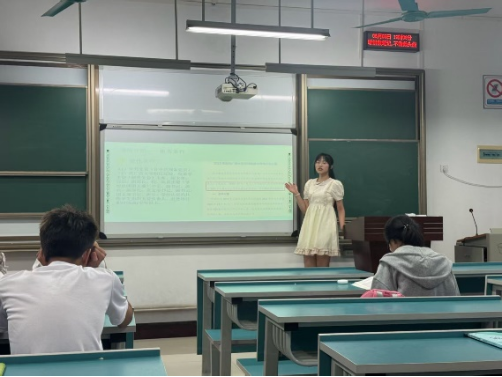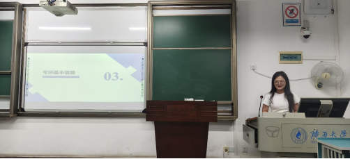 徐尉柠以“去体验,去感受,去思考,去成长”为主题进行分享。她从志愿选择、备考环境、公共课与专业课的学习、备考心态等四个方面介绍了自己备战考研的过程与心得,以自身成长故事作为案例对大一同学的四年规划提供了建议,分享了心态调适的实用方法,用轻松幽默的语言鼓励大家在尝试中收获,在思考中成长。