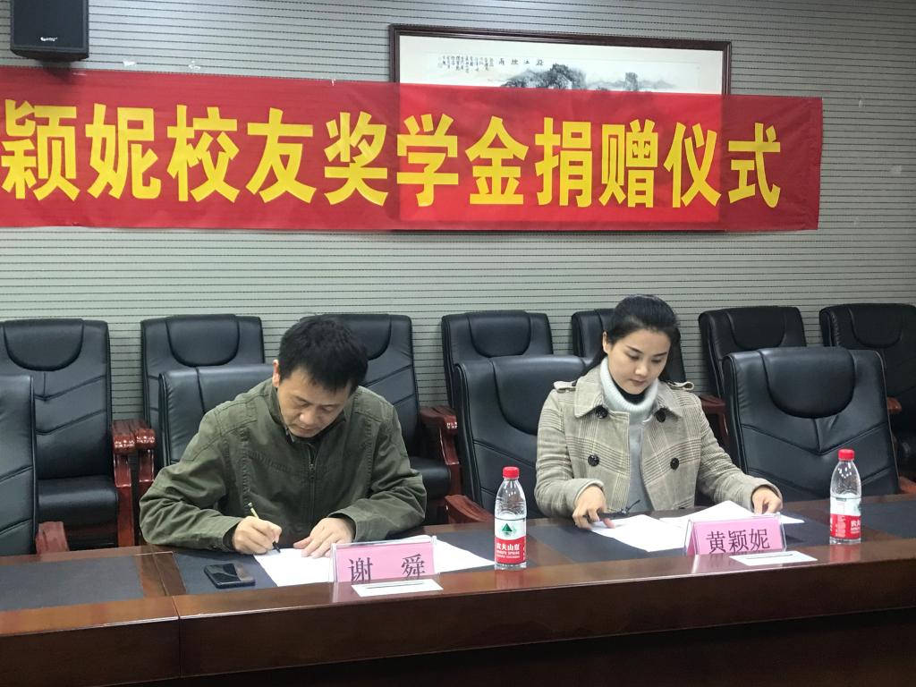 在捐赠仪式上,黄颖妮校友与谢舜书记签署奖学金捐赠协议,向学校教育发展基金会捐赠奖学金人民币10万元,用于在H动漫 设立“黄颖妮校友奖学金”,奖励保研和考研到本院继续攻读硕士研究生的优秀学生。