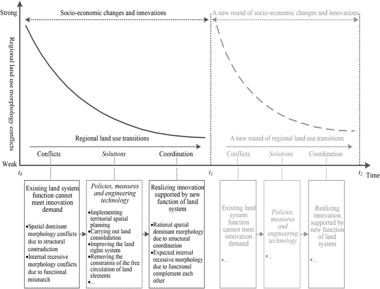 In response to this challenge, this paper integrates the man-land relationship territorial system theory from human geography with China's ongoing rural revitalization and urban-rural integration development strategies. It proposes a "Conflict-Coordination" theoretical model for regional land use transitions. This model is developed through three dimensions: changes in land use patterns leading to alterations in the structure of land systems, which subsequently result in changes in land system functions, and the regulation of land use transitions based on the coupling of patterns and processes. The aim is to enhance understanding of land use transitions and related regional development strategies, thereby contributing to the theoretical advancement of land system science.