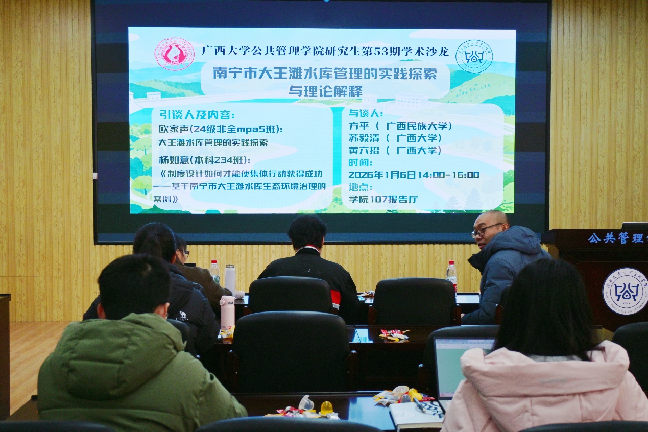 2026年1月6日下午,H动漫 暨广西高校人文社会科学重点研究基地——区域社会治理创新研究中心第五十三期学术沙龙在学院107报告厅成功举行。本期沙龙聚焦“南宁市大王滩水库管理的实践探索与理论解释”主题,由24级非全日制硕士研究生欧家声、23级本科生杨如意担任引谈人,方平、苏毅清、黄六招三位老师担任与谈人。讲座深化了师生对相关领域的研究认知,吸引了全院众多师生参与。